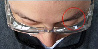 Сравните зазор между лицом и капюшоном, если смотреть сверху. Узость щели настолько различается между EYES CURE (верхний рисунок) и стеклом от общего поллиноза (нижний рисунок). Вы можете увидеть высокую степень герметичности EYES CURE. Почему это имеет значение? Это связано с тем, что EYES CURE разработана с учетом особенностей лица с учетом характеристик материала. Это оправа, которая подходит к лицу, сочетая не только форму лица, но также регулируемый гибкий резиновый дужек и форму мягкого и эластичного капюшона. Очки, не совпадающие по ширине с подушечкой для носа и переносицей, будет легче опустить, а при опускании очков зазор увеличится. Это самый важный момент для очков от сенной лихорадки и защитных очков.