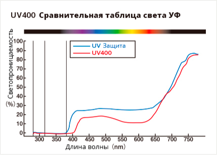 Полноценная версия защиты от ультрафиолета. Помимо ультрафиолетовых лучей, он отсекает волны длиной около 400 нм, которые вредны для глаз.